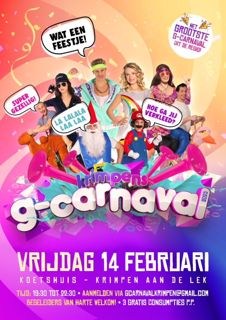 Vrijdag 14 februari van 19.30 tot 22.30 uur vieren we in Het Koetshuis in Krimpen aan de Lek het Krimpens G-carnaval weer! Als grootste G-carnaval uit de hele regio, gaan we er natuurlijk een fantastisch feest van maken. Hoe kom jij verkleed?